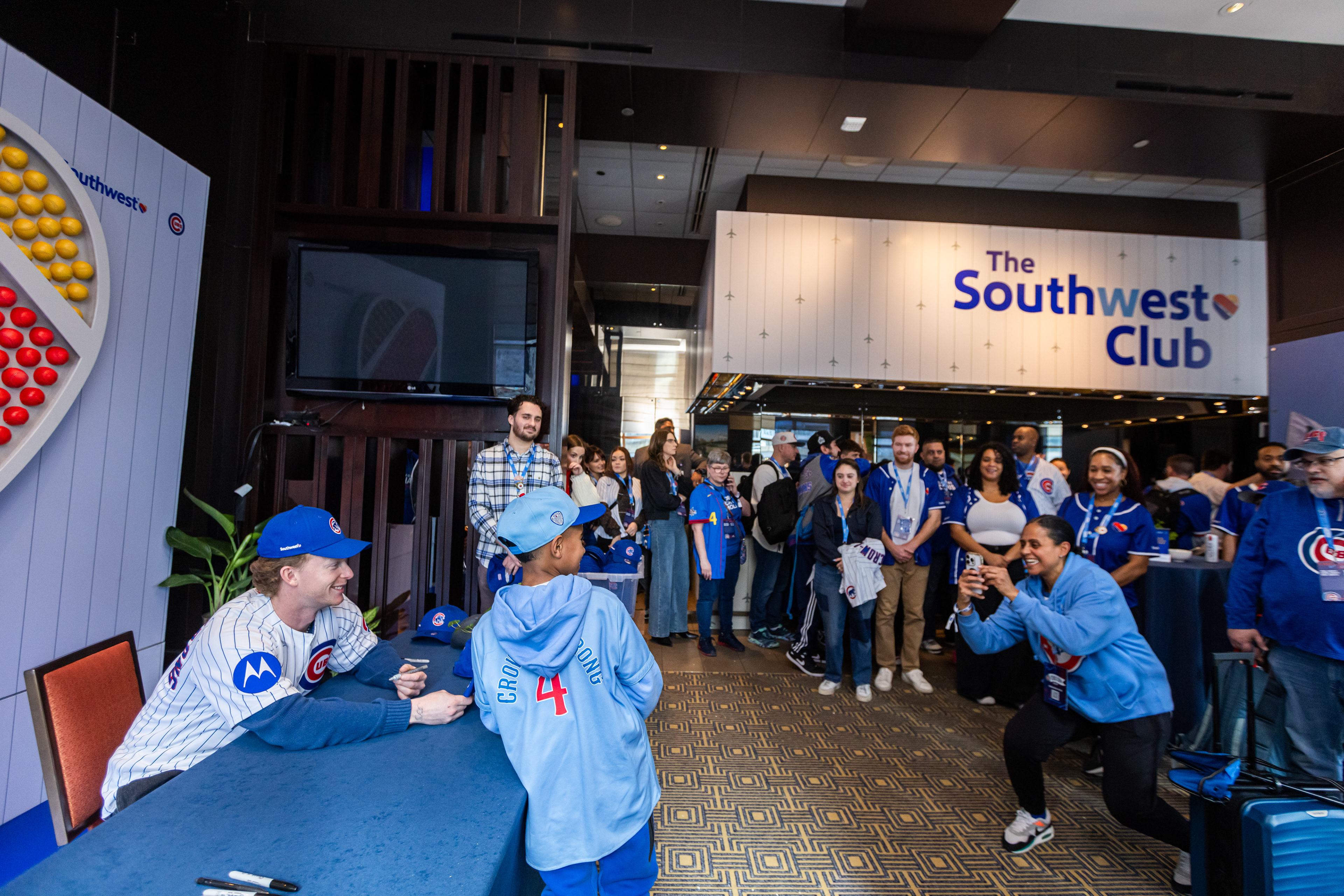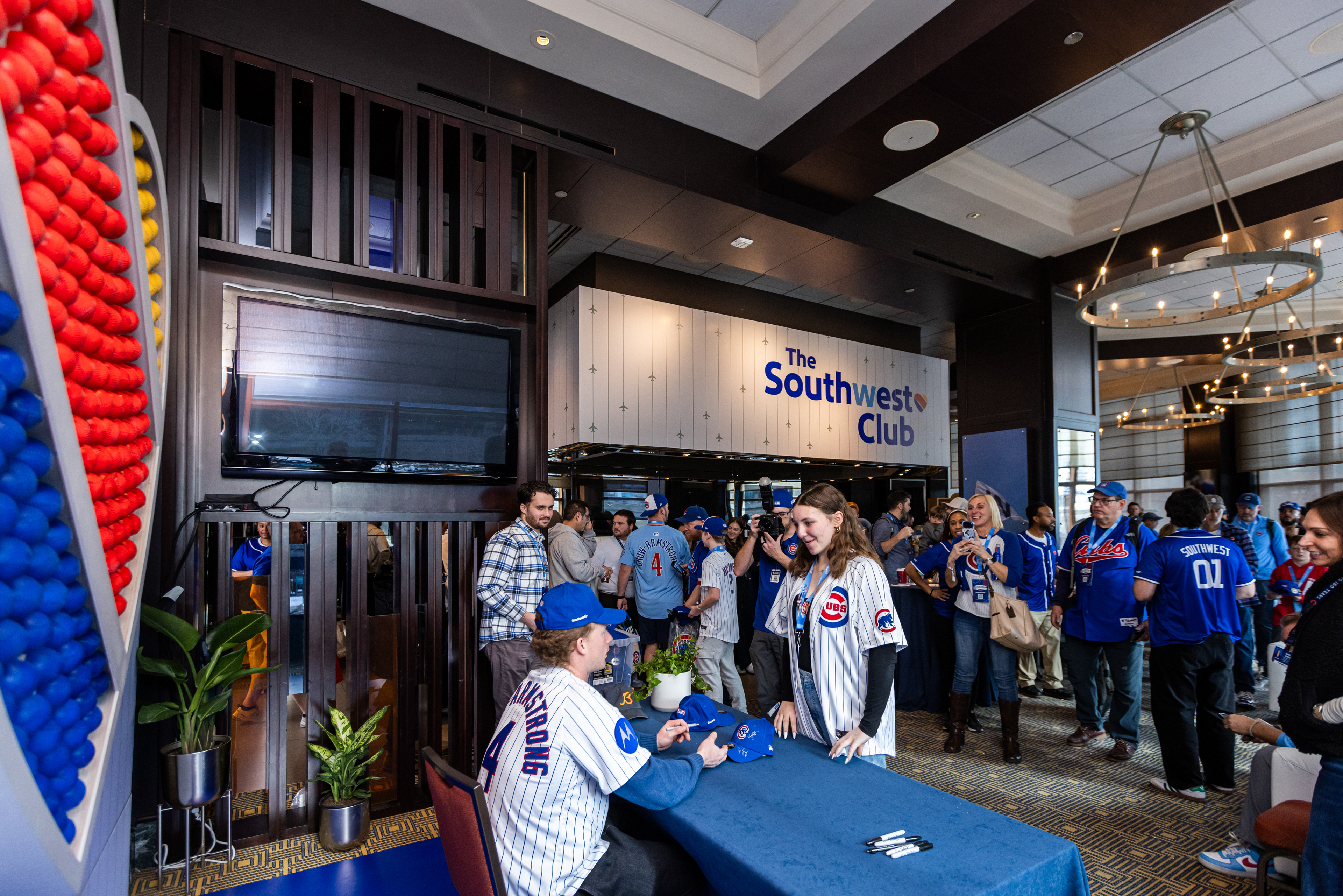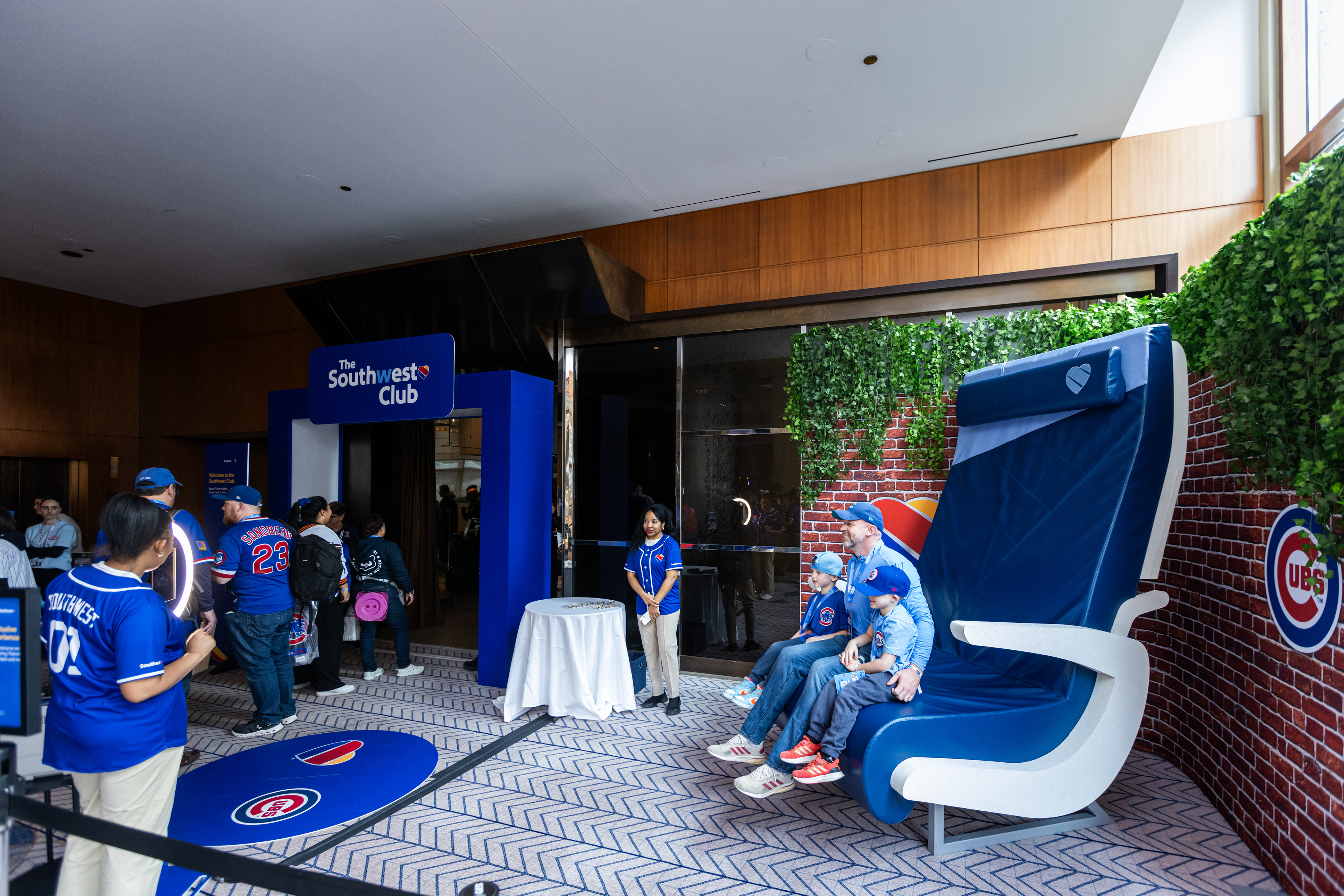 Brand Ambassadors welcomed Season Ticket Holders through an illuminated tunnel into an airport-style lounge featuring Southwest Club perks, including elevated food and a private bar, soft seating, a custom hat and pin station, and opportunities to meet and mingle with Cubs legends, all delivered with signature Southwest-level hospitality.
